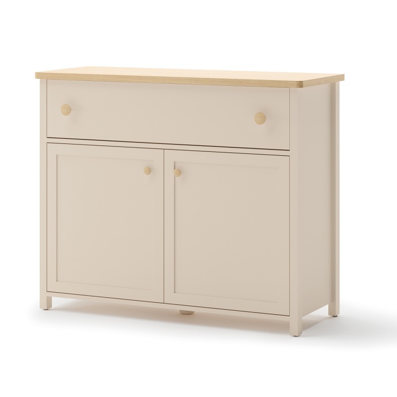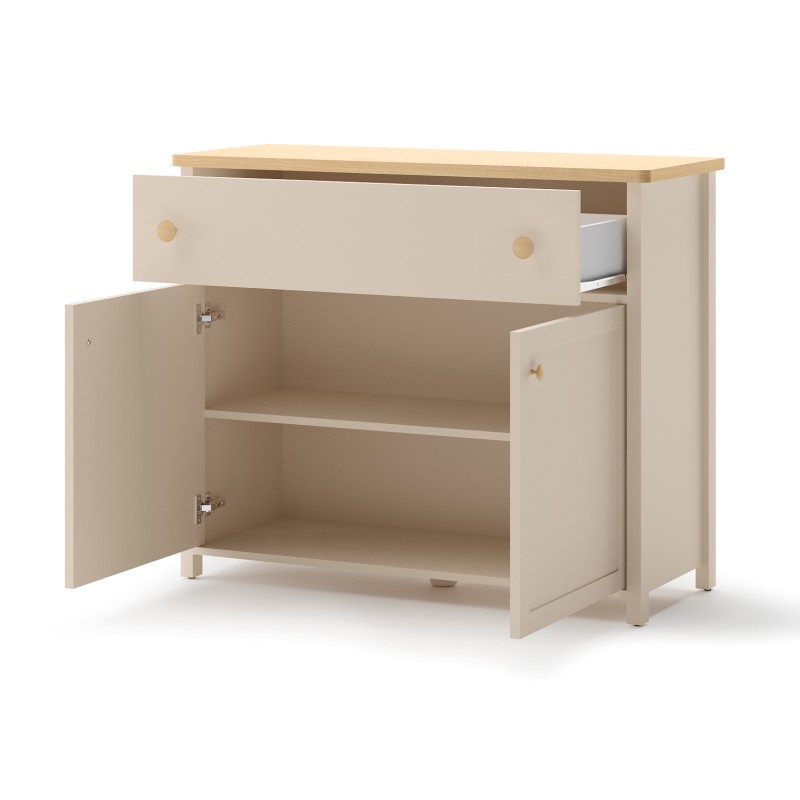 Pojemna dwudrzwiowa komoda z szufladą pomieści codzienną garderobę. Mebel wykonano z wytrzymałej płyty laminowanej wykończonej trwałym obrzeżem ABS. Uchwyty z tworzywa. Do skompletowania z nadstawką z lustrem SO-06.