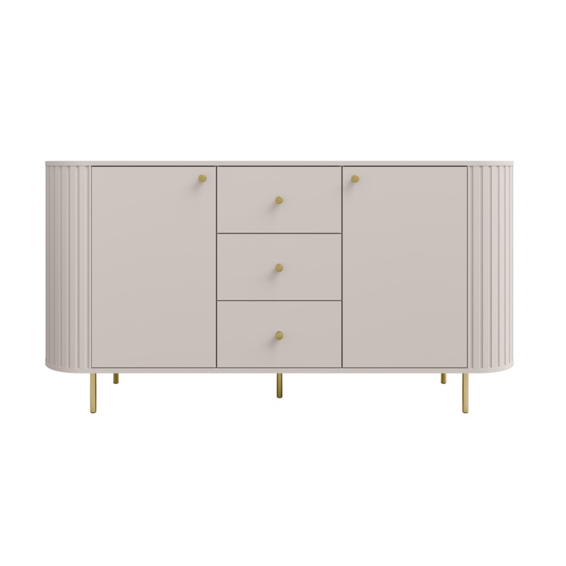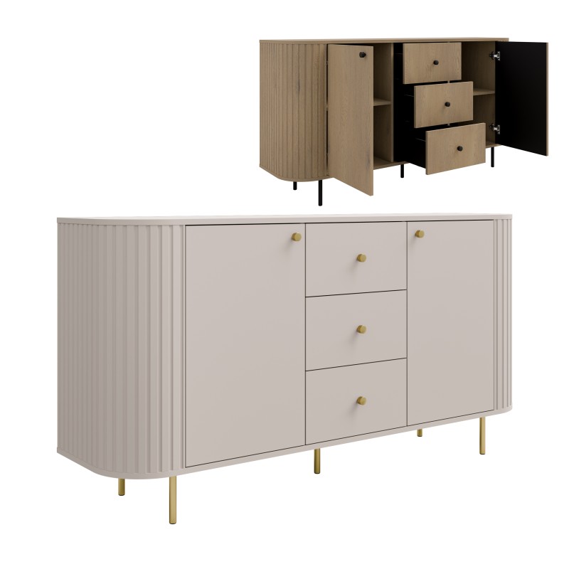barwach ziemi, takich jak piaskowy beż i dąb cremona, wzbogacona o akcenty w czerni i złocie, które przełamują jasne tonacje. Proste, metalowe nogi oraz uchwyty dostępne w dwóch