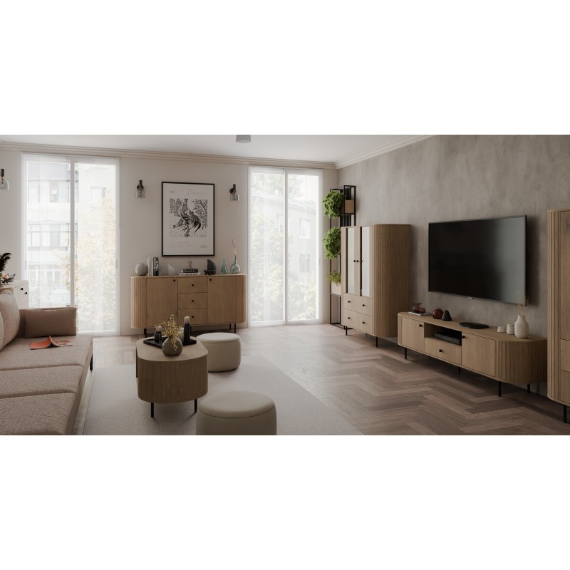 wariantach kolorystycznych – czarnym i złotym – nadają meblom lekkości, nie przytłaczając ich. Kolekcja została zaprojektowana tak, aby każdy element – od witryn i komód, po ławy i