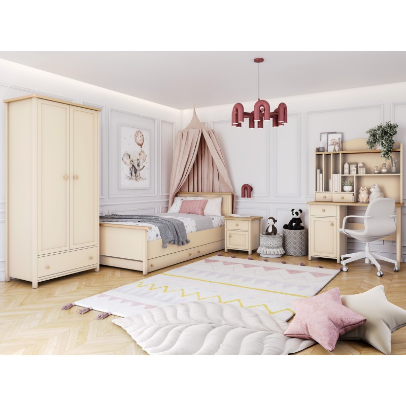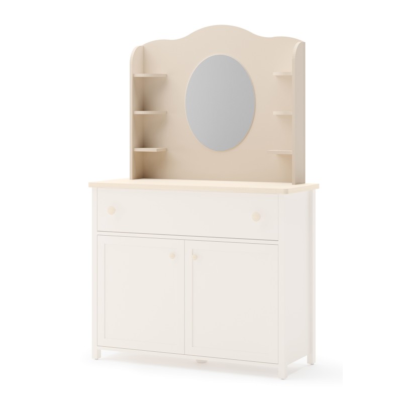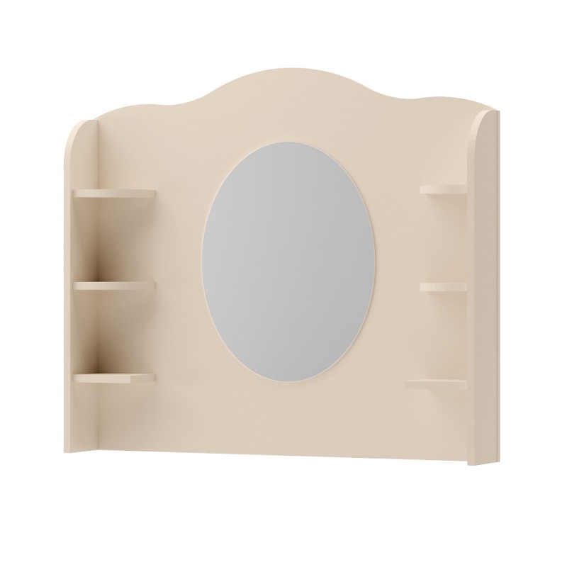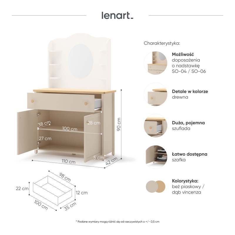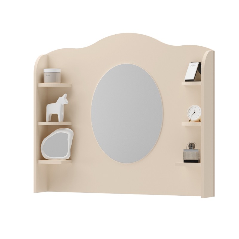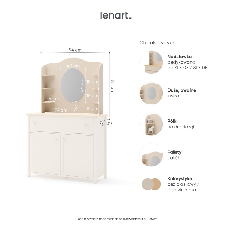 Nadstawka - toaletka do skompletowania z biurkiem (SO-03) lub komodą (SO-05) idealna do pokoju każdej elegantki. Wyposażona w duże lustro w kształcie owalu oraz małe półeczki na kosmetyki, dekoracje lub inne akcesoria. Mebel wykonano z wytrzymałej płyty laminowanej wykończonej trwałym obrzeżem ABS.