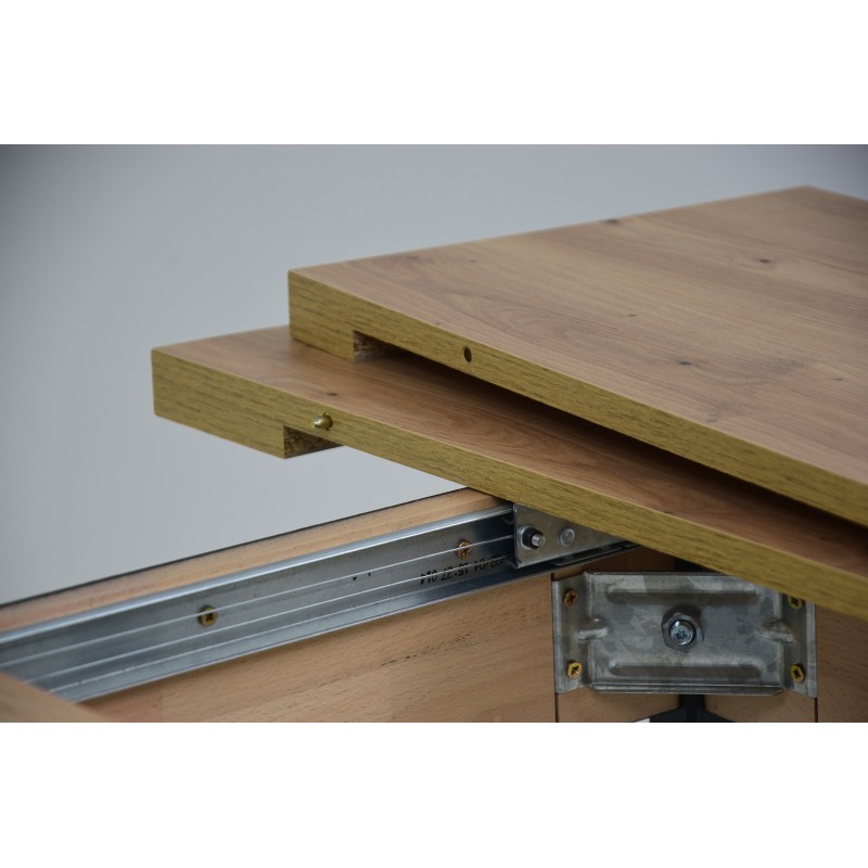 - Stół rozkłada się na prowadnicach łożyskowych. Po złożeniu, wkładki nie można przechowywać pod blatem