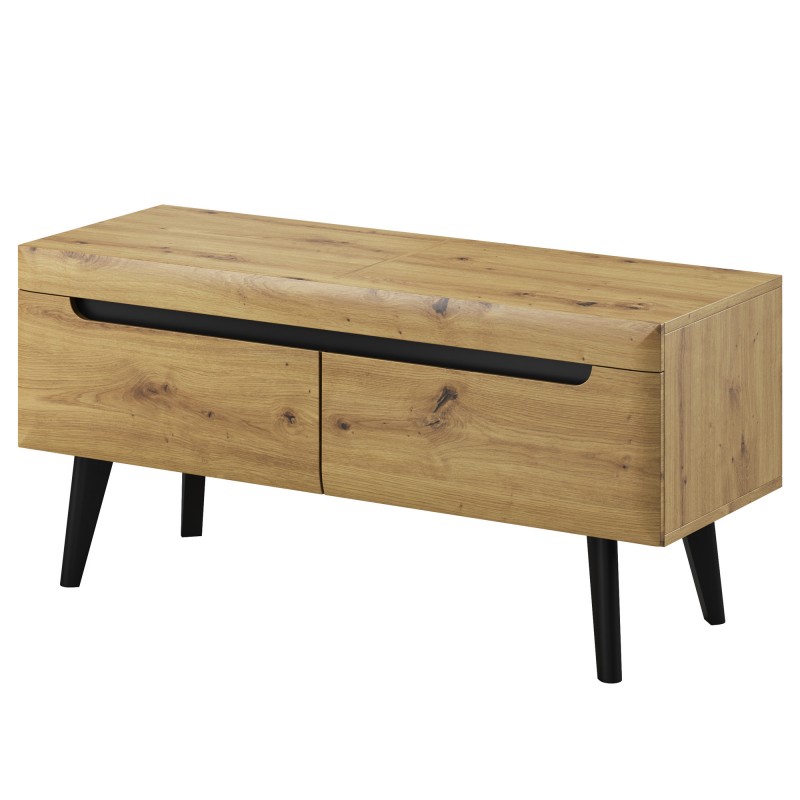 - Niecodzienne połączenie połysku z dębowym dekorem i wysoką nogą o kształcie nawiązującym do formy frontów.