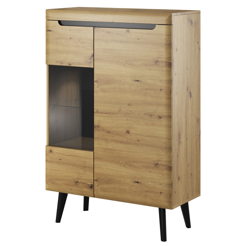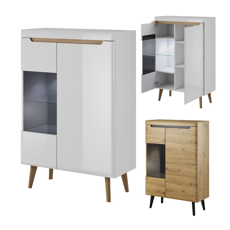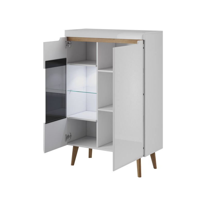 - Niecodzienne połączenie połysku z dębowym dekorem i wysoką nogą o kształcie nawiązującym do formy frontów.