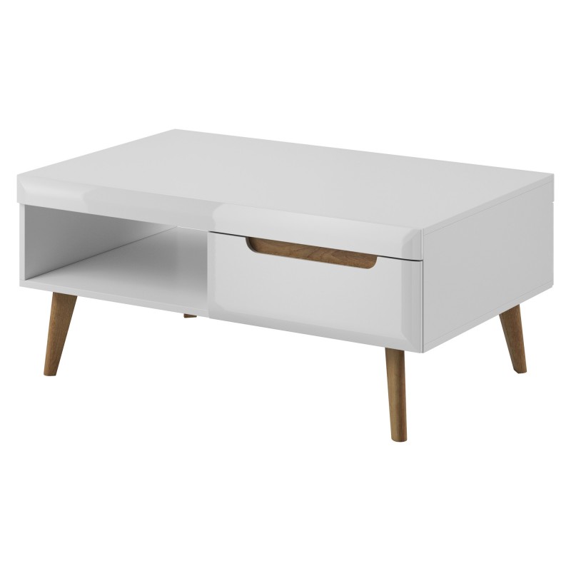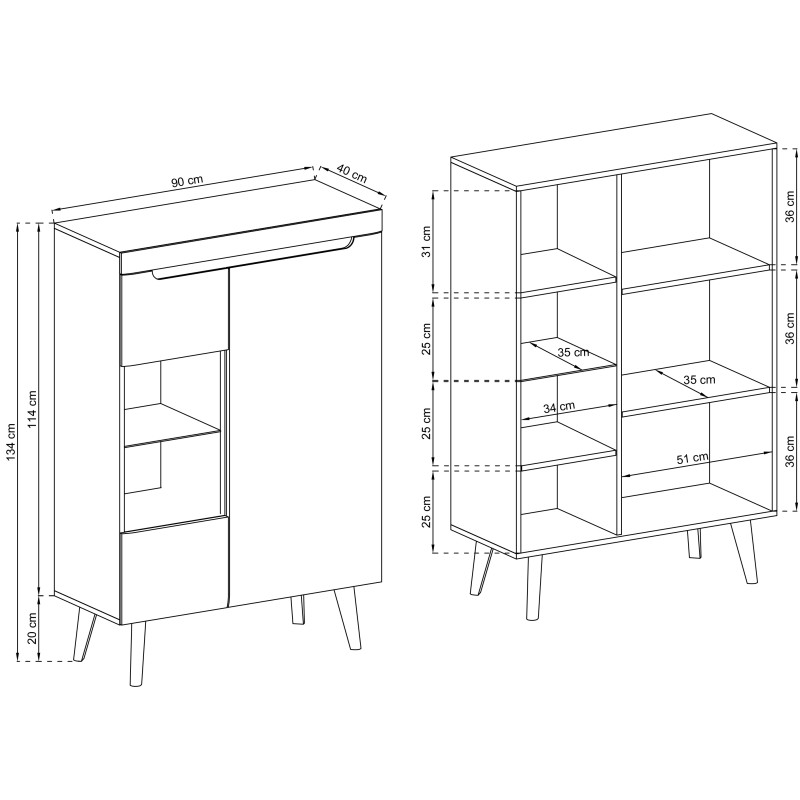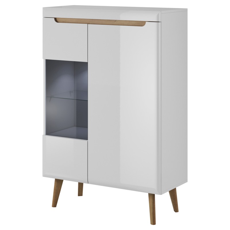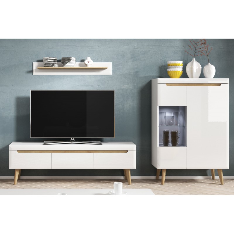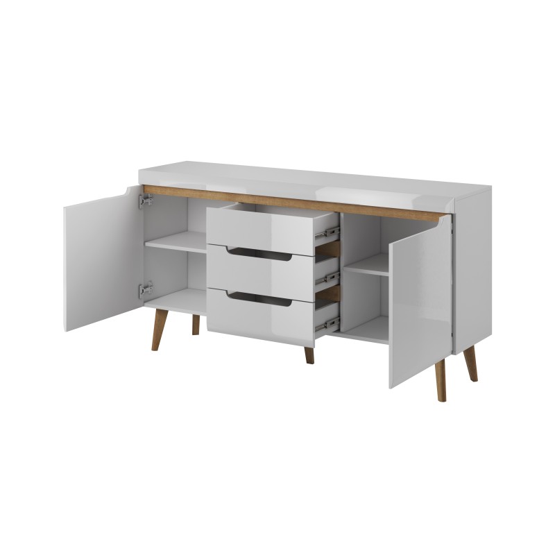 - Niecodzienne połączenie połysku z dębowym dekorem i wysoką nogą o kształcie nawiązującym do formy frontów.